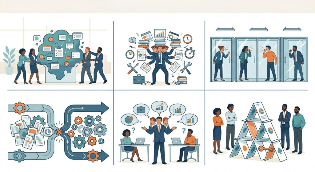 A governance hiánya jellemzően nem látványos összeomlásban, hanem állandó súrlódásokban jelenik meg. Vezetők és projektvezetők versengenek ugyanazért a kulcserőforrásokért, a projektek csendben csúsznak, és a felsővezetés utólag szembesül a problémákkal.